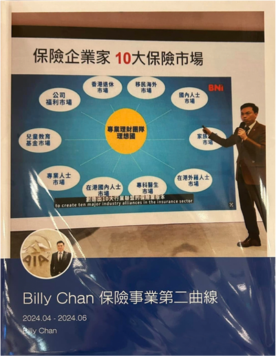 在保險與行銷領域深耕二十年後,BILLY CHAN化傳統經驗為全新價值。由銷售產品,建立短期關係,至現在透過人脈變現的力量,塑造高效的產品生態圈。BILLY 從一位保險從業員,蛻變成商業上的超級連接者,建立跨界別合作,打造精英團隊,創建保險事業的理想國。